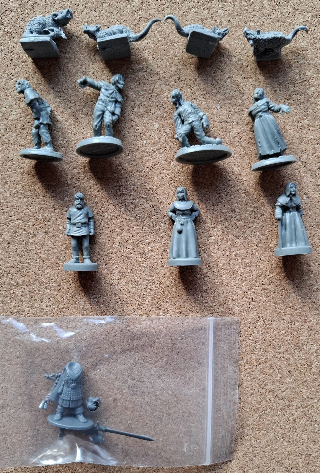 Scenario 1, The Deserted Village, calls for zombies and giant rats. Initially there are 4 zombies and 2 rats, but more arrive throughout the game both as a result of Events and investigating Clues. If the heroes do nothing, there'll be a maximum of 14 zombies and 5 rats, but I don't think I'll need that many. There's also the chance of finding a survivor.